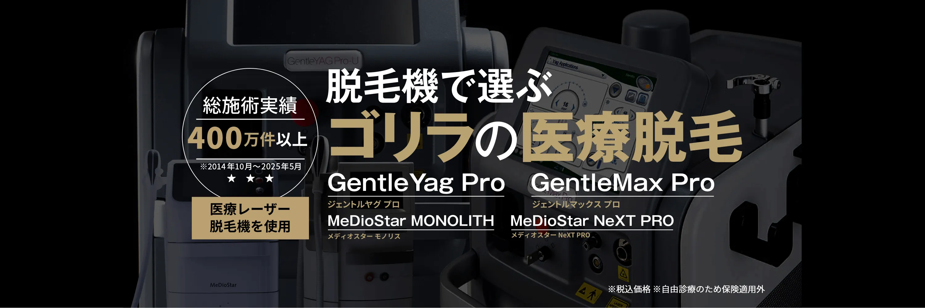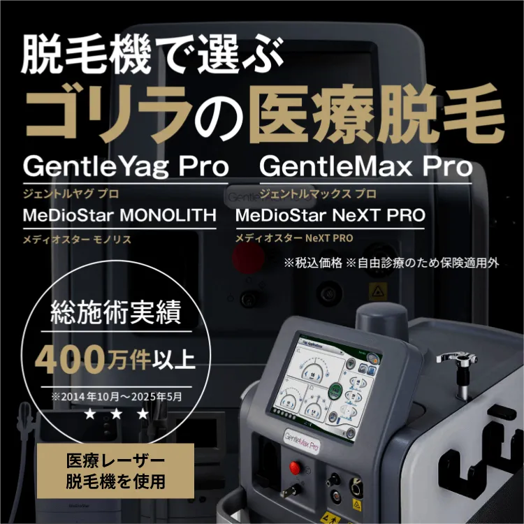 ゴリラクリニックの蓄熱式脱毛では、ダイオードレーザーのメディオスターネクストプロ、メディオスターモノリスを使用しています。これらの脱毛機はメラニン吸収率が良い810nmと940nmの波長で照射するため、男性の薄い毛から濃い毛まで効果的な脱毛が可能です。