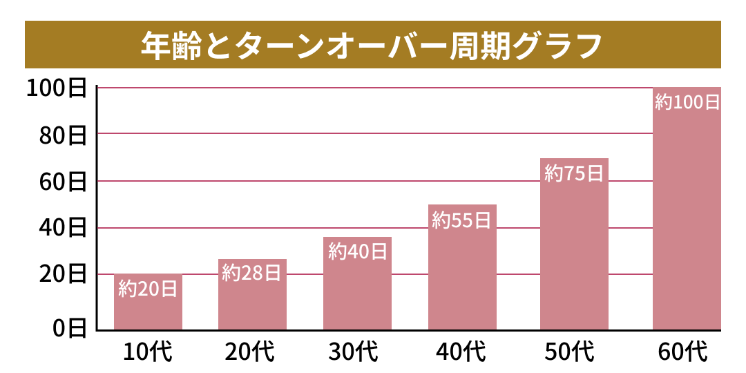 ターンオーバーとは肌の表皮の生まれ変わりサイクルのことを指し、正常な肌の周期は約28日と言われています。肌は、新しい細胞が生成され、古い皮膚は剥がれる流れを繰り返しています。正常な肌であれば、自然に剥がれ落ちますが、年齢とともに剥がれ落ちるために必要なタンパク質が減っていきます。正常に剥がれ落ちずに蓄積することで、ニキビが治りにくくなるだけでなく、ニキビ跡やシミの原因にもなります。