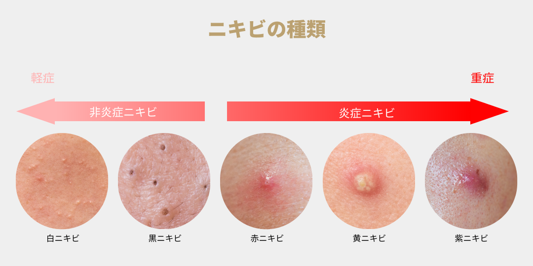 炎症ニキビは、毛穴の中で炎症を起こしたニキビです。炎症が進み、化膿した状態の「黄ニキビ」、ニキビがさらに悪化し内出血を伴うことで起こる「紫ニキビ」へと重症化する場合がありますので、炎症ニキビを治す際は適切な治療が重要となってきます。