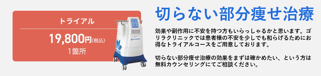 仕上がりは自然ですが、局所的な部分痩せに適しているため、範囲の大きいお腹や、女性より体型が大きい傾向にある男性には適していません。