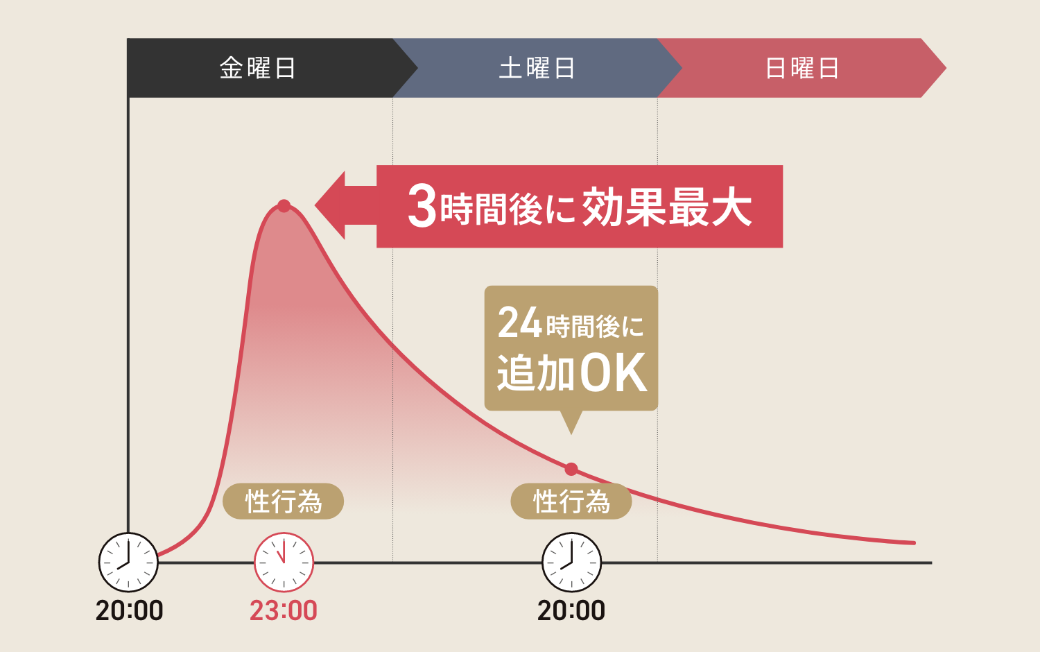 | 服用間隔 | 必ず、24時間空けてください。1度服用した後は24時間の間隔を空けることで再度服用ができます。 |