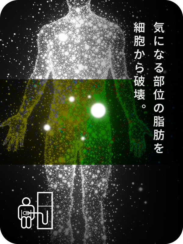ストレスフリーで脂肪細胞のみにアプローチする医療機器を用いて、気になる部位の皮下脂肪のサイズを約15〜25%減少させます。※個人差があります。