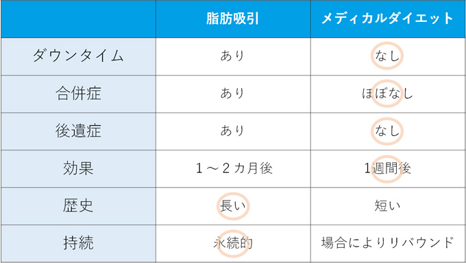 脂肪吸引とメディカルダイエットの違いを下の表で示します。