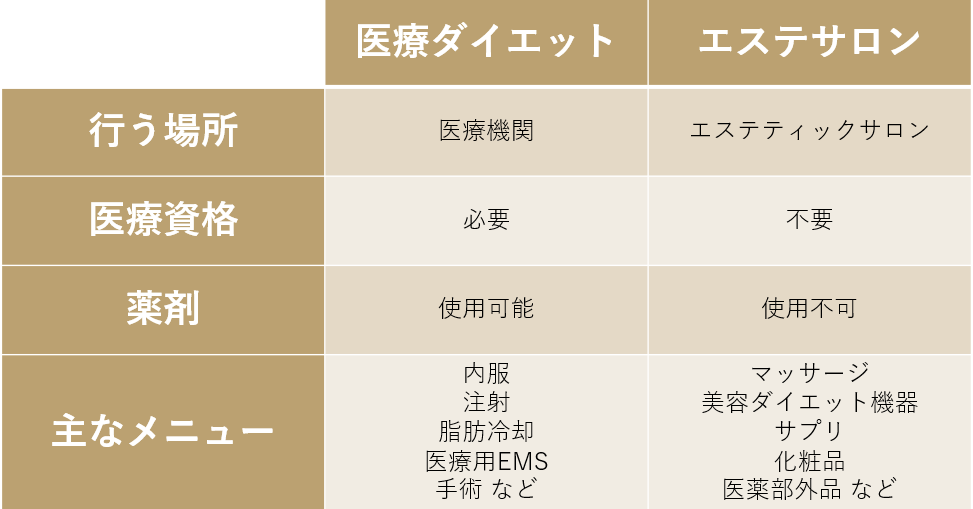・エステで行われるダイエットと医療ダイエットは施術内容が大きく異なる。