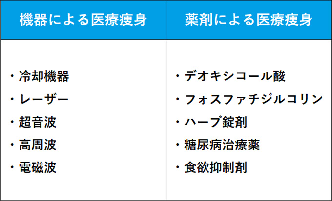 医療痩身やメディカルダイエットとも呼ばれます。内服薬や注射によって食欲を減らし、摂取カロリーを抑え体重減少をもたらす方法や、医療機器によって皮下脂肪を燃焼または凍結させ、脂肪細胞を体外に排出させる方法などが挙げられます。