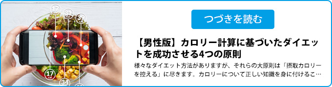 間食やアルコールはダイエットの妨げにもなるので、控えめにすることも大切です。なお別記こと「【男性版】 カロリー計算に基づいたダイエットを成功させるための4つの原則」にて、ダイエット時の食事についても紹介していますので、合わせてご覧ください。