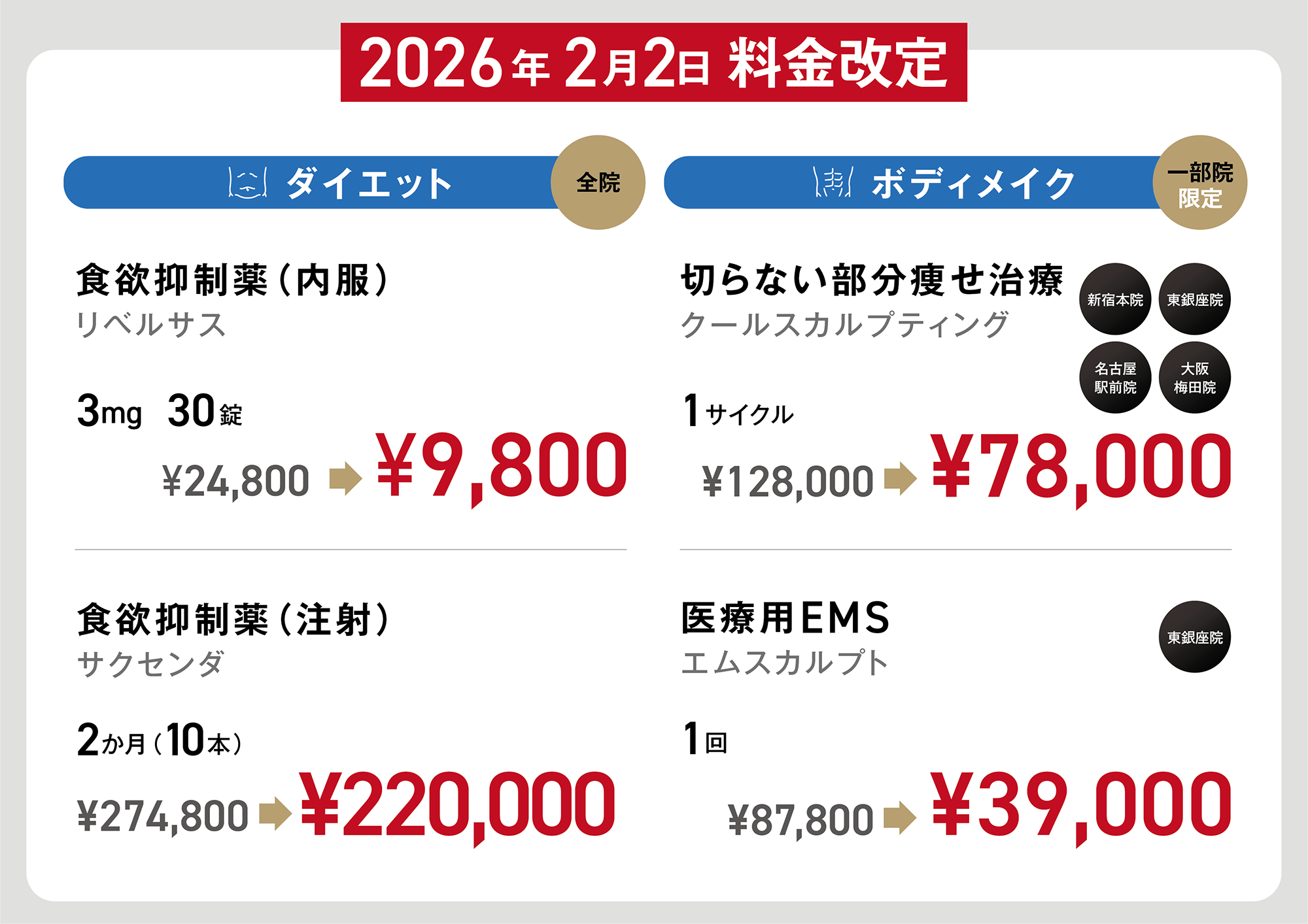 ゴリラクリニックの医療ダイエットでは、服用するだけの「食欲抑制薬」、「内臓脂肪燃焼薬」、脂肪細胞を破壊する「切らない部分痩せ治療」、インナーマッスルにまでアプローチする「医療用EMS」の4つのアプローチをご用意しております。