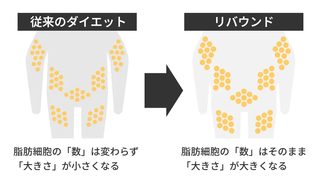 肥満の要因の一つとして、脂肪を蓄える「脂肪細胞」があります。運動や食事制限により脂肪細胞を小さくすることは可能ですが、細胞数自体は変化しないため、生活習慣が元に戻ると再び脂肪が蓄積し、リバウンドする可能性があります。