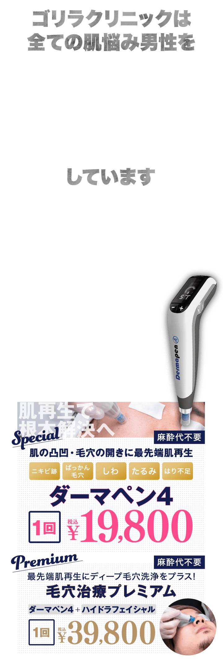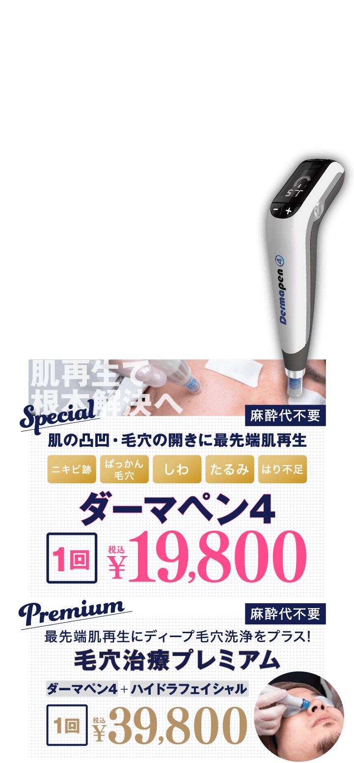 肌の凸凹や毛穴の開きなどは疾患として認められないため、自由診療での案内になります。ゴリラクリニックでは自由診療だからこそ、保険診療の皮膚科では取り扱っていない治療や機器を取り揃えています。