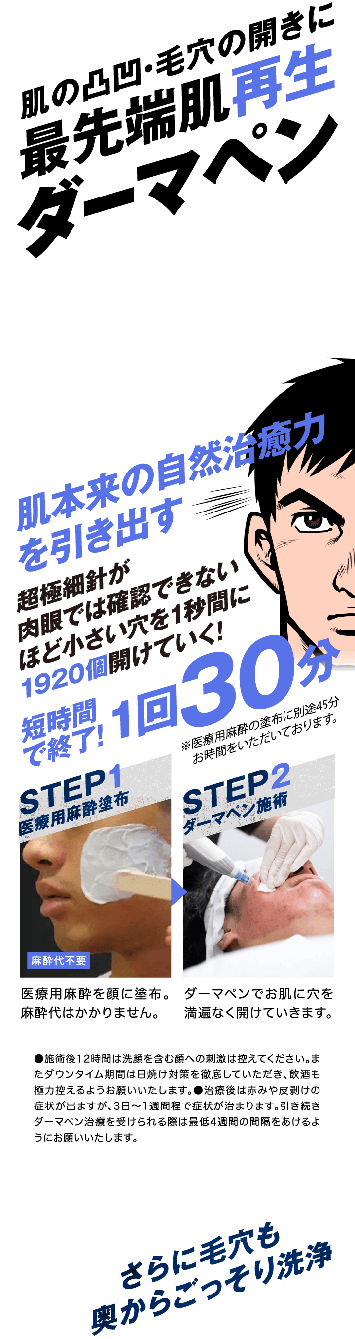 ダーマペンは極細針を皮膚の表層に挿入する施術になります。痛みを軽減させる為の麻酔クリームを使用して、施術を行いますが少なからずお痛みがございます。