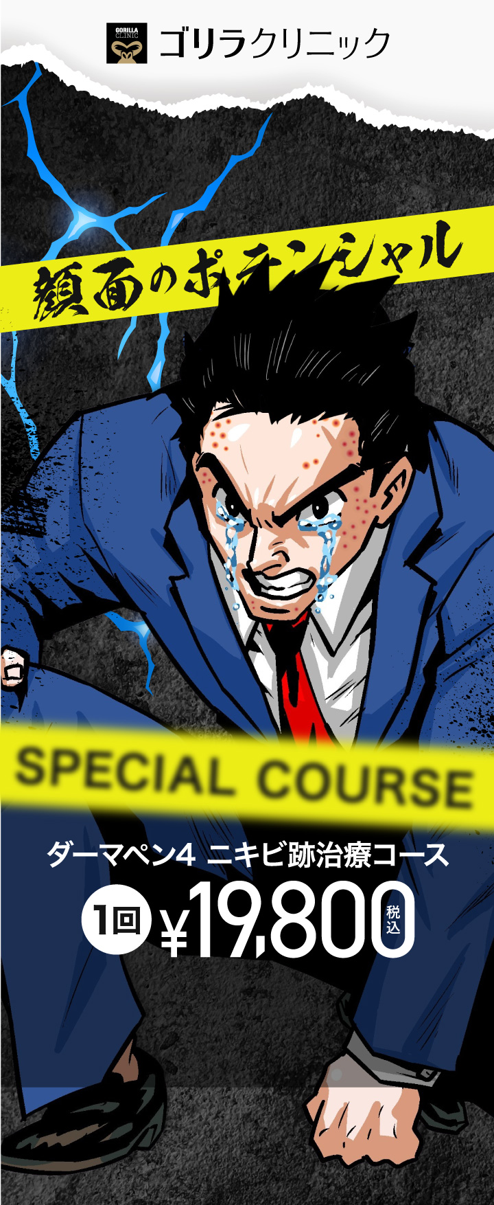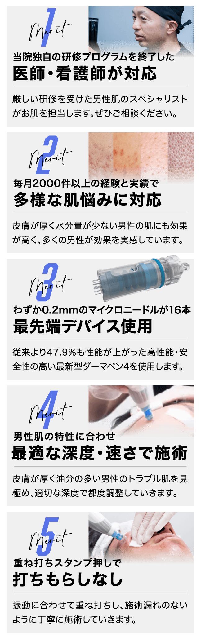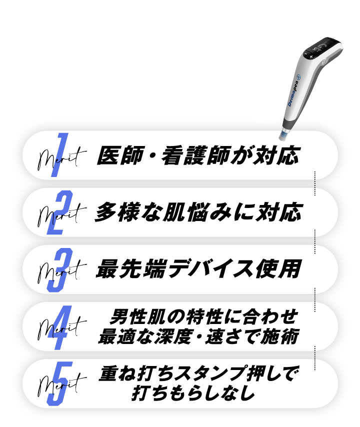 ゴリラクリニックでは患者様一人ひとりにあった針の長さを医師、看護師が部位ごとで判断します。また特に気になる部分は重ね打ちやスタンプ押しなど、男性肌ならではの施術方法を提供しています。