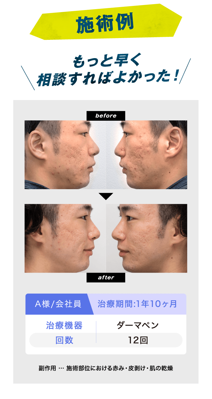 ハリやツヤなどは施術後2~3日で体感できますが、凹みを改善されたい方は複数回施術することを推奨しております。1回の施術のみで凹みが改善すると誇大広告しているクリニックにはお気をつけください。