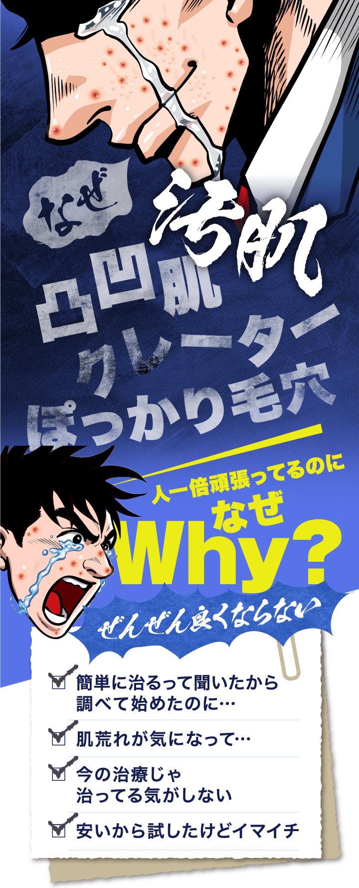 肌の凸凹などのニキビ跡は市販のスキンケア等でケアしても治りません。